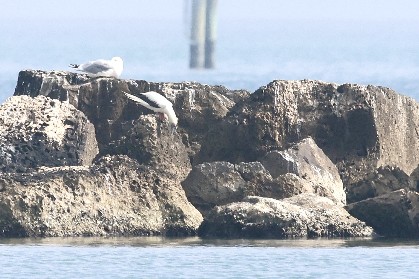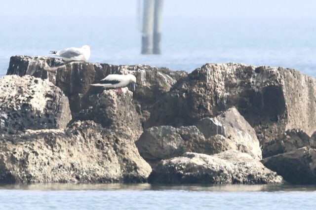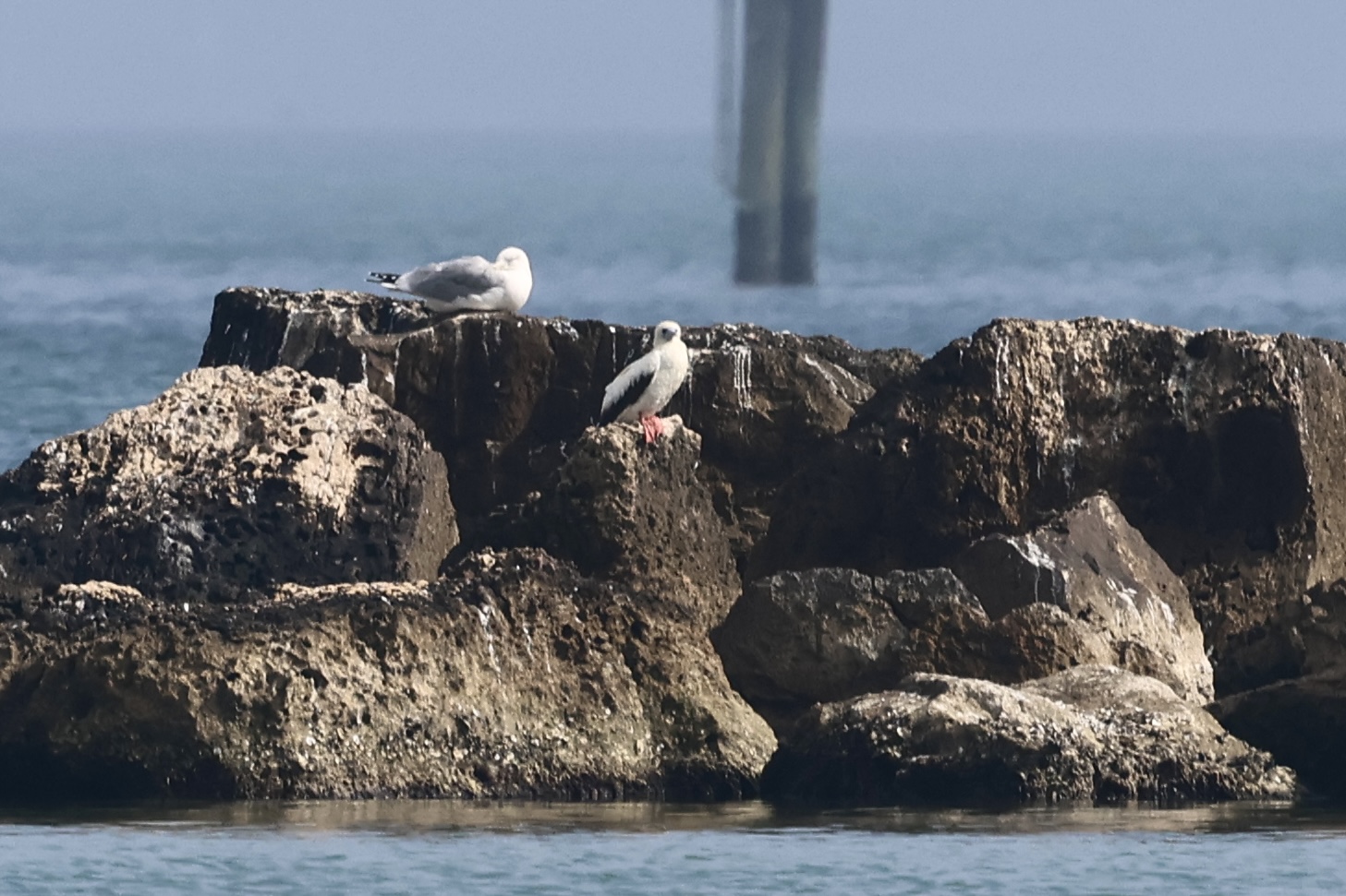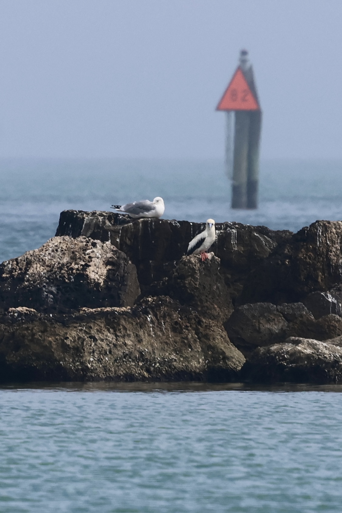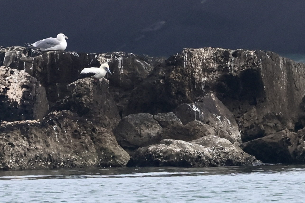The fog had not cleared for a while and we had to head south at least at twelve. Then, at 11:40 the fog suddenly decided that we had waited for long enough and opened a window for us to look at the breakwater! After a scan, I spotted the Red-footed Booby and got great views!